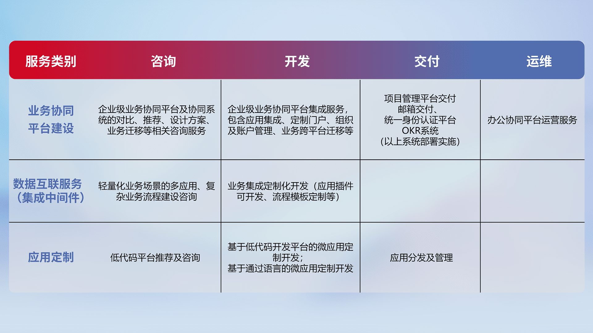 针对钉钉、、、、企微、、、、IDaas等平台级产品提供产品的规划、、方案、、交付、、、定制化开发等服务,,,实现如统一协同办公、、、智能客户服务、、、混合会议管理、、、智能数据查询、、等业务场景,,实现数字化转型。。